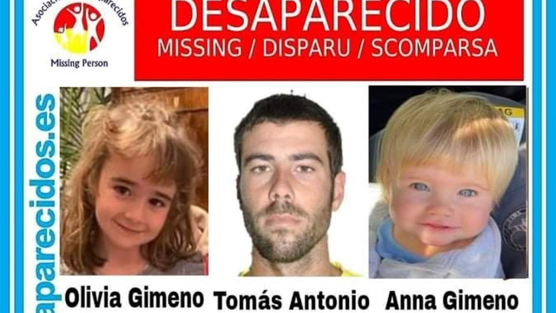 Últimas noticias en directo sobre las niñas desaparecidas en Tenerife las hermanas Anna y Olivia y su padre Tomás Gimeno. Los medios movilizados en el dispositivo de búsqueda de un padre y sus dos hijas de 1 y 6 años desaparecidos desde el martes en Tenerife han hallado por el momento un silla infantil de retención en vehículos flotando en el mar que es propiedad de la familia y que podría pertenecer a la pequeña Anna. Sigue la búsqueda de Anna y Tomás Gimeno la última hora de la autopsia y toda la actualidad de Beatriz la madre de las.